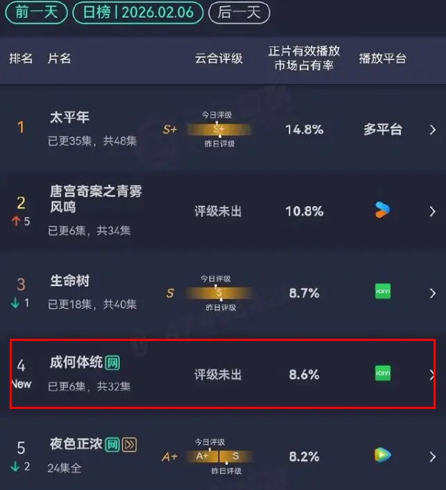 《生命树》刚官宣定档,就获得网友们的关注,因为这部剧是杨紫和胡歌主演的,演员阵容绝对是顶配中的顶配,可这部剧的题材也比较小众,从云合数据占比上看,《生命树》排在第三名,第一名是《太平年》,第二名是《唐宫奇案之青雾风鸣》。