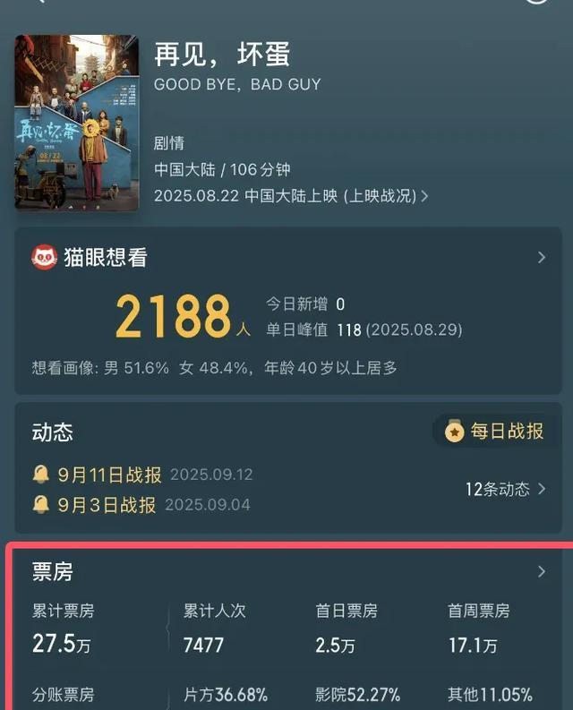 《再见坏蛋》只有27.5万的总票房,片方分账了9.5万,可谓是血亏,而吴京的公司登峰国际是排在了出品方的第二名,相信投资也是很大的,但就是被观众抛弃了;